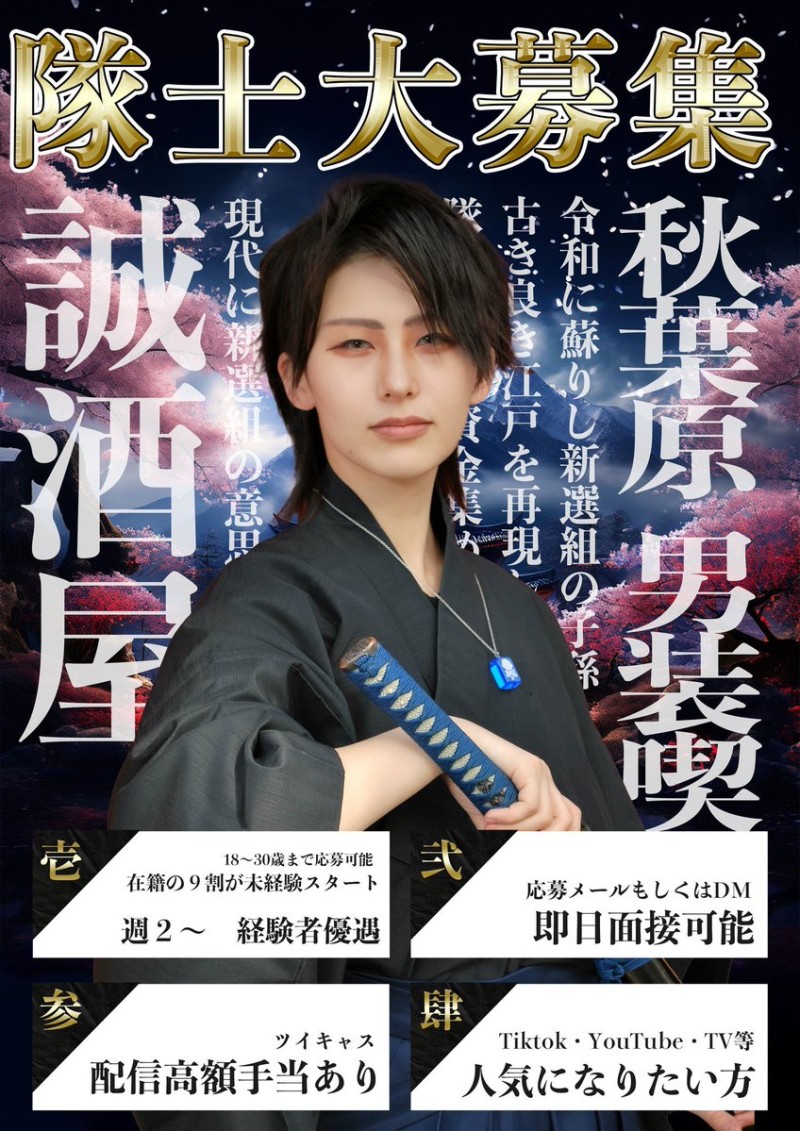 【男装募集】 誠酒屋の"新人隊士"を募集します🏯🌕 新撰組の和装を着て、いつもと違う自分にチャレンジしよう🇯🇵 【経験者優遇・🔰未経験者 大歓迎です!】 即日、面接OK👌ご応募、詳細はこちらから 👉 https://t.co/xbwZHPL2xP #秋葉原 #男装カフェ #誠酒屋 #男装バイト #コンカフェ求人 #TikTok https://t.co/h43bE5SZxA