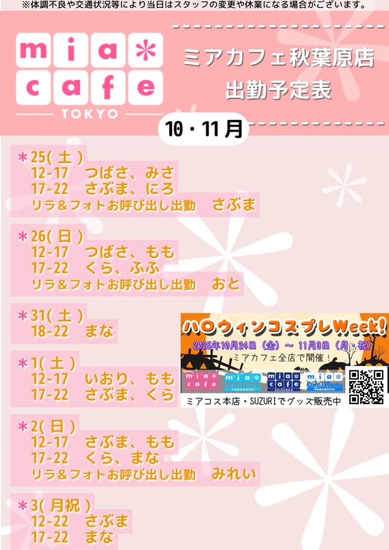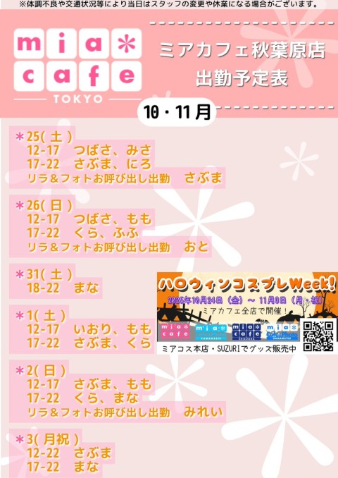 ★#メイドカフェ ・ミアカフェ #秋葉原 店★ ☕️営業予定日☕️ 👻#ハロウィン フリーコス EV👻 🎃10月25日(土)  12-17 つばさ,みさ  17-22 さぶま,にろ  リラ&フォトお呼び出し出勤 さぶま 🎃10月26日(日)  12-17 つばさ,もも  17-22 くら,ふふ  リラ&フォトお呼び出し出勤 おと #コスプレ https://t.co/Iw8jqpvp1W