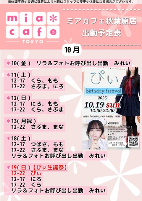 | 営業時間 | ●ミアカフェ東京店(メイドカフェ)http://www.mia-cafe.com/ ● □平日 月~金 17:00~22:00 □土曜・日曜・祝日 12:00~22:00 ★定休日 なし(2019年1月より定休日廃止) □ラストオーダー 閉店の60分前 22:00閉店の場合→21:00ラストオーダー 営業日や出勤状況についてはこちら。 http://pandaland.cutegirl.jp/mif/c_cms_csv/sch_top.php ●ミアリラ&フォト東京店(撮影会&リフレ)http://www.mif-lr.com/ ● □全日 12:00〜22:00 ですがリラクゼーション出勤スタッフがいる時間帯のみ営業です。 ★定休日は不定休(出勤スタッフがいる時間帯の営業) □最終受付 閉店の45分前 22:00閉店の場合→21:15(21:50迄に施術時間が終わるコース) ※高校生不可 ●深夜営業については、公式サイト右上の http://market.chu.jp/schedule1/sche37.cgi ミアグループ総合スケジュール(PC・スマホ) http://market.chu.jp/schedule1/sche37.cgi?dm=1 ミアグループ総合スケジュール(ガラ携帯) をご覧ください。告知日のみ営業となります。告知日以外は深夜営業いたしておりません。 深夜営業対象日 22:00〜翌朝5:00(L.O.4:00) | ||||||||||||||